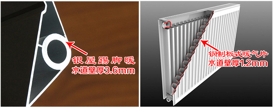 传统暖气片的水道壁薄得像张纸,0.6-1.5 毫米的厚度,加上一堆焊接点,用不了几年就可能被水腐蚀,漏水、维修成了烦心事。银屋踢脚暖的水道壁却厚实得很,2.5-3.6 毫米的 “身板”,是传统暖气片的 1.5-3 倍,而且一根到底没焊点,像个 “铁打的汉子”,扛得住压力、耐得住腐蚀,只要水质合适,能陪着房子一起慢慢变老,几十年不用操心换供暖设备。